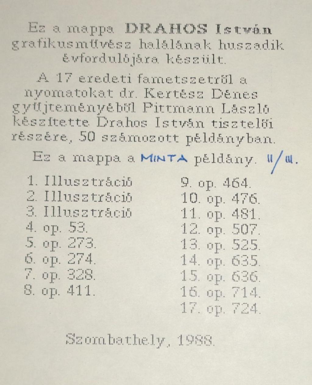 Pittman László: Ez a mappa DRAHOS ISTVÁN grafikusművész halálának huszadik évfordulójára készült, 50 példányban.