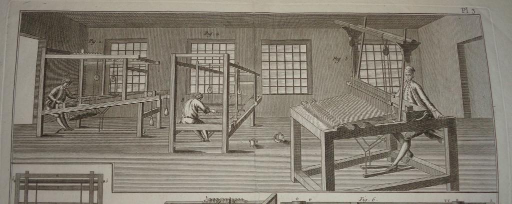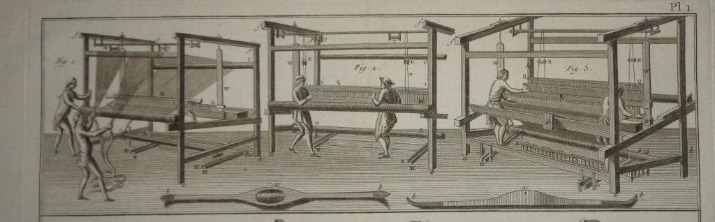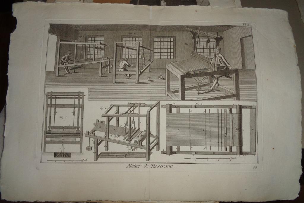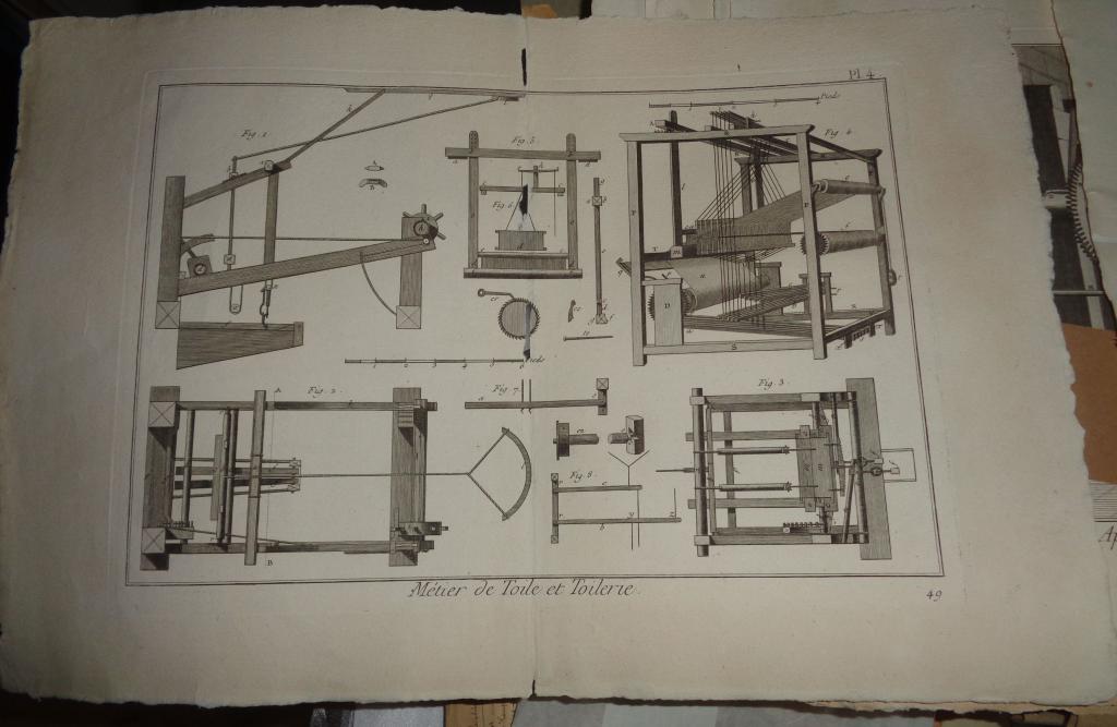 profession, industry history put into the basket Robert Bénard (1734–1777): Métier à Draps. I-IV. (Posztószövőszék, takács mesterség)-(Cloth Loom or Broadcloth Weaving Loom. Weaver craft).