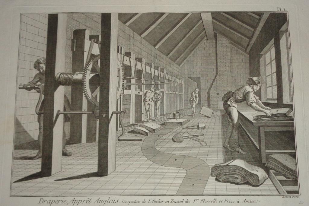 Robert Bénard (1734–1777): Draperie, Apprêt Anglois. I-V. (Angol kikészítés, a szövet készítés befejező folyamata)-(Drapery, English Finishing or Cloth Finishing Workshop).