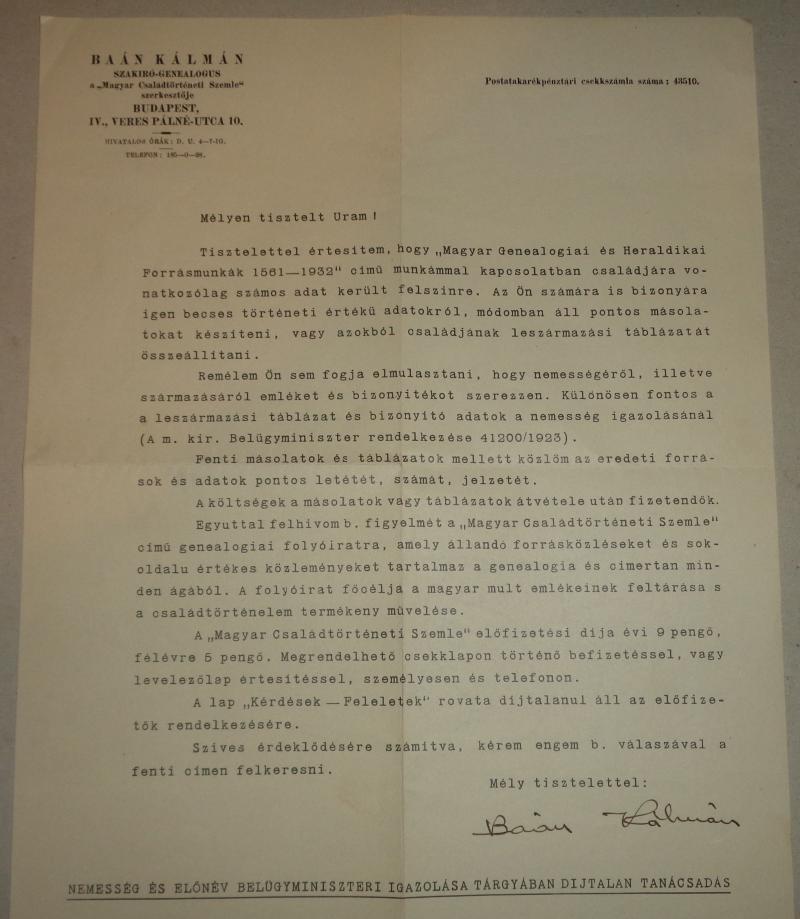 Baán Kálmán propaganda nyomtatványa, az aláírásával.