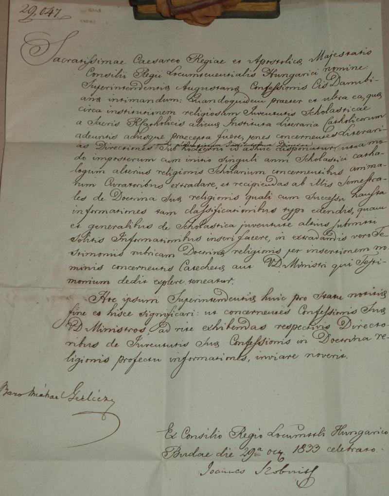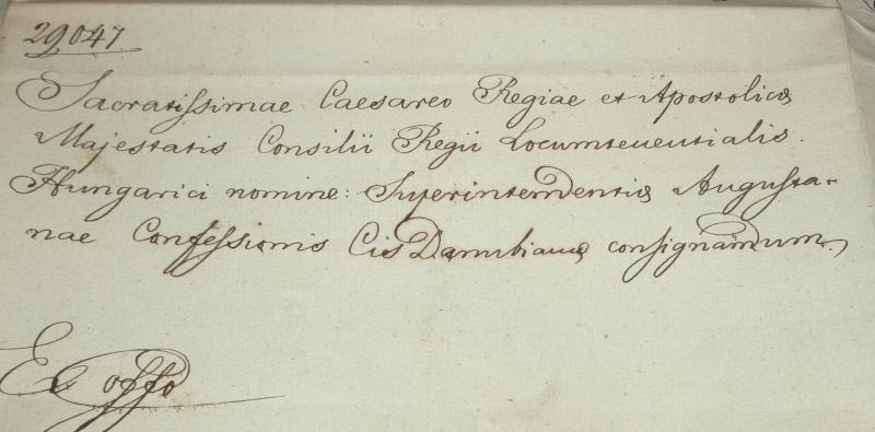 Sacratissimae Caesareo Regiae et Apostolicae Majestatis Consilii Regii Locumtenentialis Hungarici nomine Superintendenti Augustanae Confessionis Cis-Danubianae intimandum: