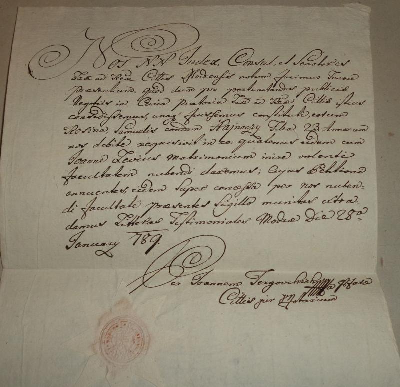 Nos N. N. Judex, Consul, et Senatores Liberae ad Regiae Civitatis Modrensis notum facimus Tenore praesentium, Quod deimo pro pertractandis publicis Negotiis in Curia praetoria Liberae ad Regiae Civitatis istius condedissemus, unaq[ue] fuissemus constituti, eotum Rosina, Samuelis condam Hajnóczy Filia 23 Annorum nos debite requisivit in eo: quatenus eidem cum Joanne Levius Matrimonium inire volenti facultatem nubendi daremus; Cujus Petitioni annuentes, eidem super concessa per nos nubendi facultate praesentes Sigillo munitas extradamus Litteras Testimoniales Modrae die 28va January 789.